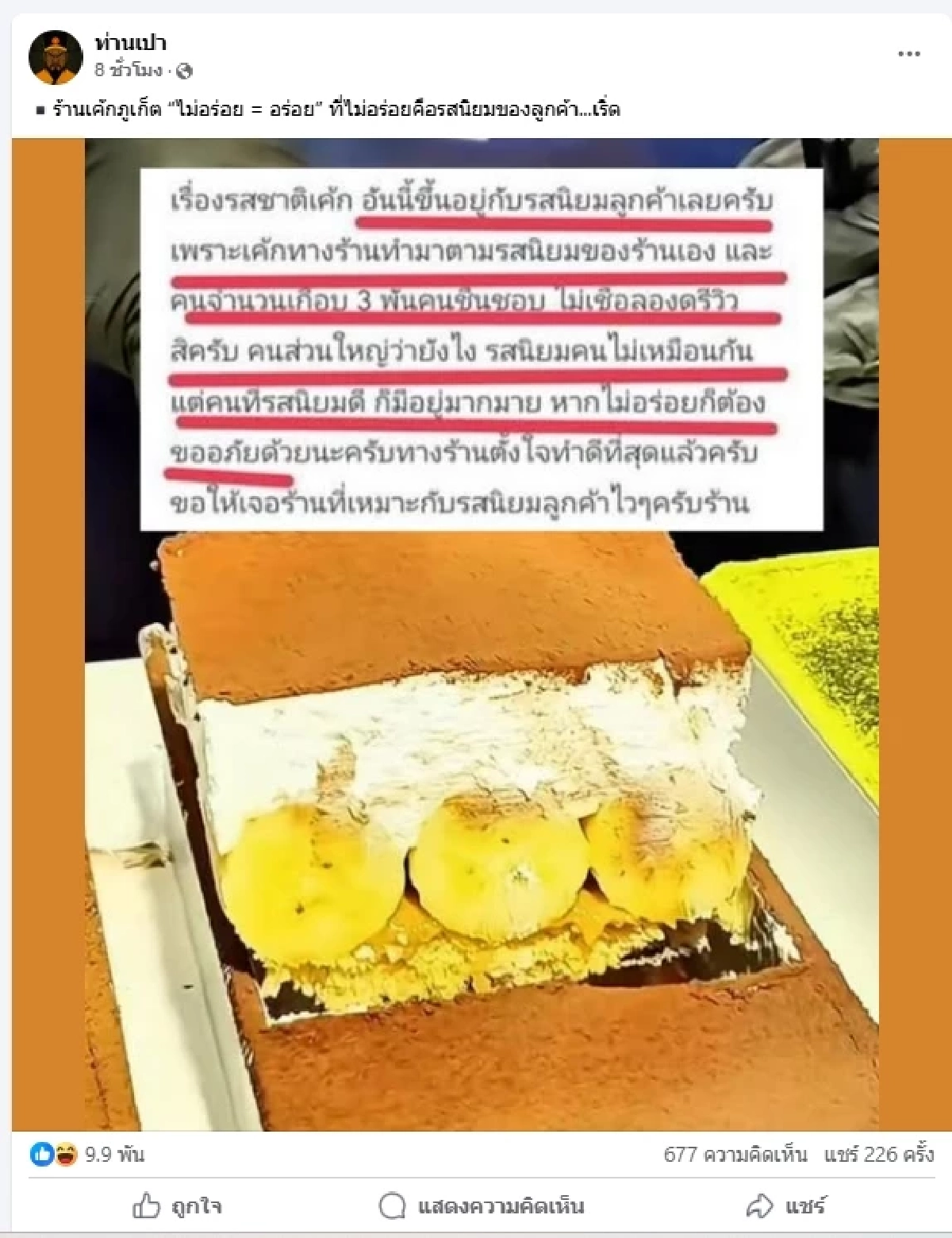 กลายเป็นประเด็นร้อนแรงบนโลกออนไลน์ เมื่อเพจดังอย่าง "ท่านเปา" ได้เปิดประเด็นเกี่ยวกับร้านเค้กชื่อดังในจังหวัดภูเก็ต ที่ถูกกล่าวหาว่า "ขู่ฟ้องลูกค้าที่ให้คะแนนรีวิว 1 ดาว" ระบุว่า เค้กร้านภูเก็ต “ไม่อร่อย = อร่อย” รับได้แต่รีวิวบวก ลูกค้าคนไหนติดตาว 1 ดวงทักไปขู่ฟ้องบังคับให้ลบรีวิว พร้อมกับแนบภาพข้อความที่ร้านส่งให้ลูกค้าว่า "คุณเคยรีวิวร้านอื่นอย่างไรผมไม่ทราบ ถ้าคุณไม่ต้องการจะเดือดร้อนและออกจากความรู้สึกไม่สบายใจนี้ ผมเสนอให้คุณไปลบรีวิวนั้น แล้วทุกอย่างจะจบครับ" จนดราม่าดังกล่าวกลายเป็นที่ชาวเน็ตวิพากษ์วิจารณ์อย่างหนัก