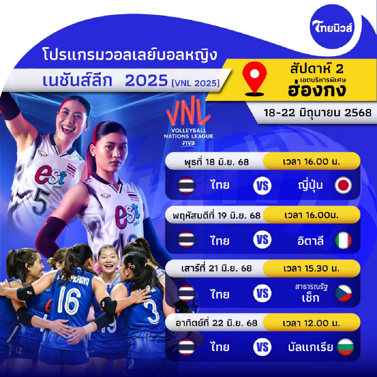 "วอลเลย์บอลหญิงล่าสุด" โปรแกรม วอลเลย์บอลหญิงเนชันส์ลีก 2025 วันนี้ 19 มิถุนายน 2568 ทุกคู่ อัพเดตตารางคะแนน VNL 2025