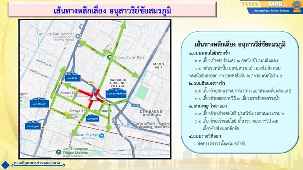 วันที่ 25 มิ.ย. 68 กองบัญชาการตรวจนครบาล (บช.น.) ประชาสัมพันธ์เส้นทางหลีกเลี่ยงการชุมนุมบริเวณอนุสาวรีย์ชัยสมรภูมิ ในวันที่ 28 มิ.ย. 2568 ดังนี้