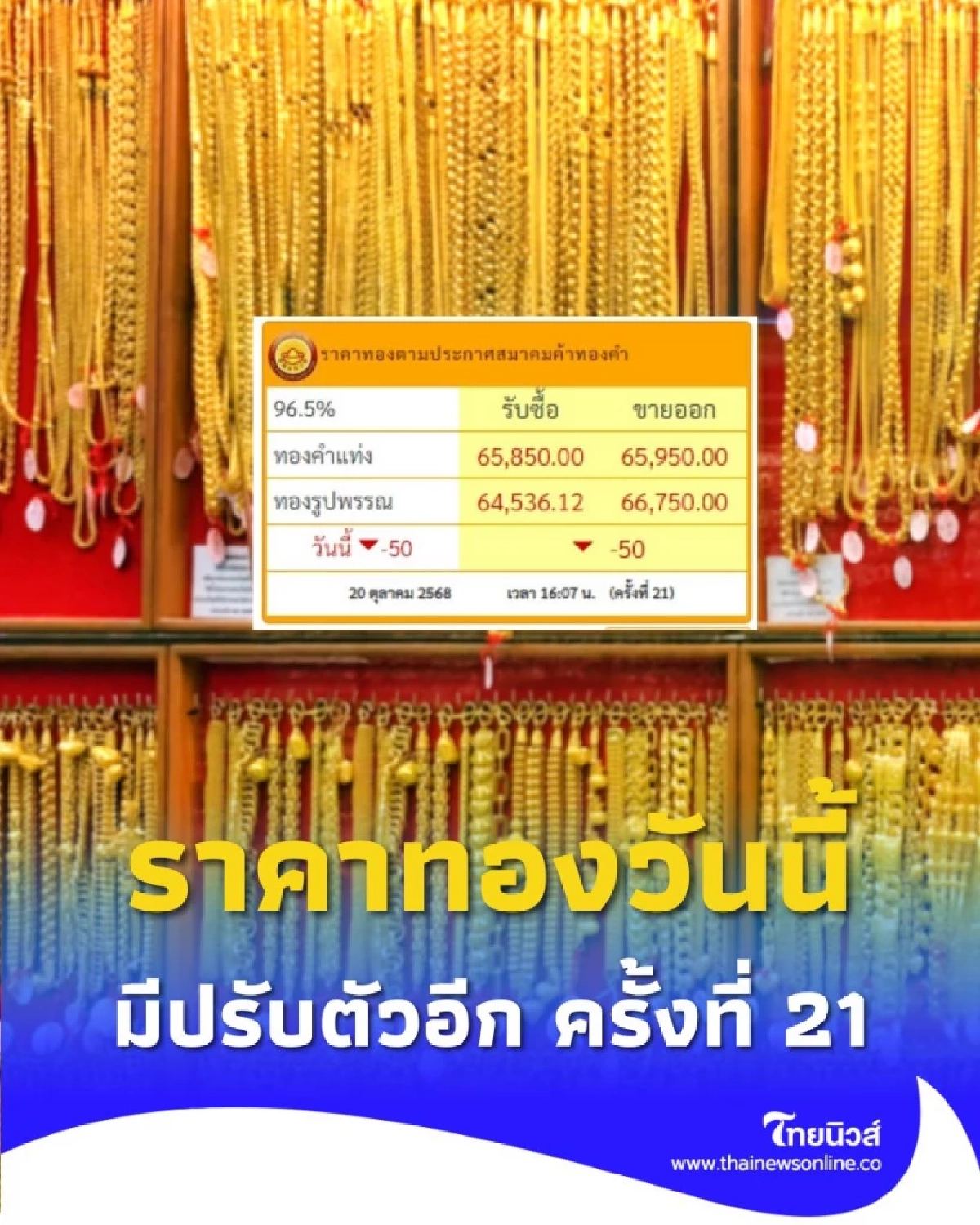 ราคาทองวันนี้ 20 ตุลาคม 2568 ราคาทองวันนี้มีปรับตัวอีกครั้งที่ 21