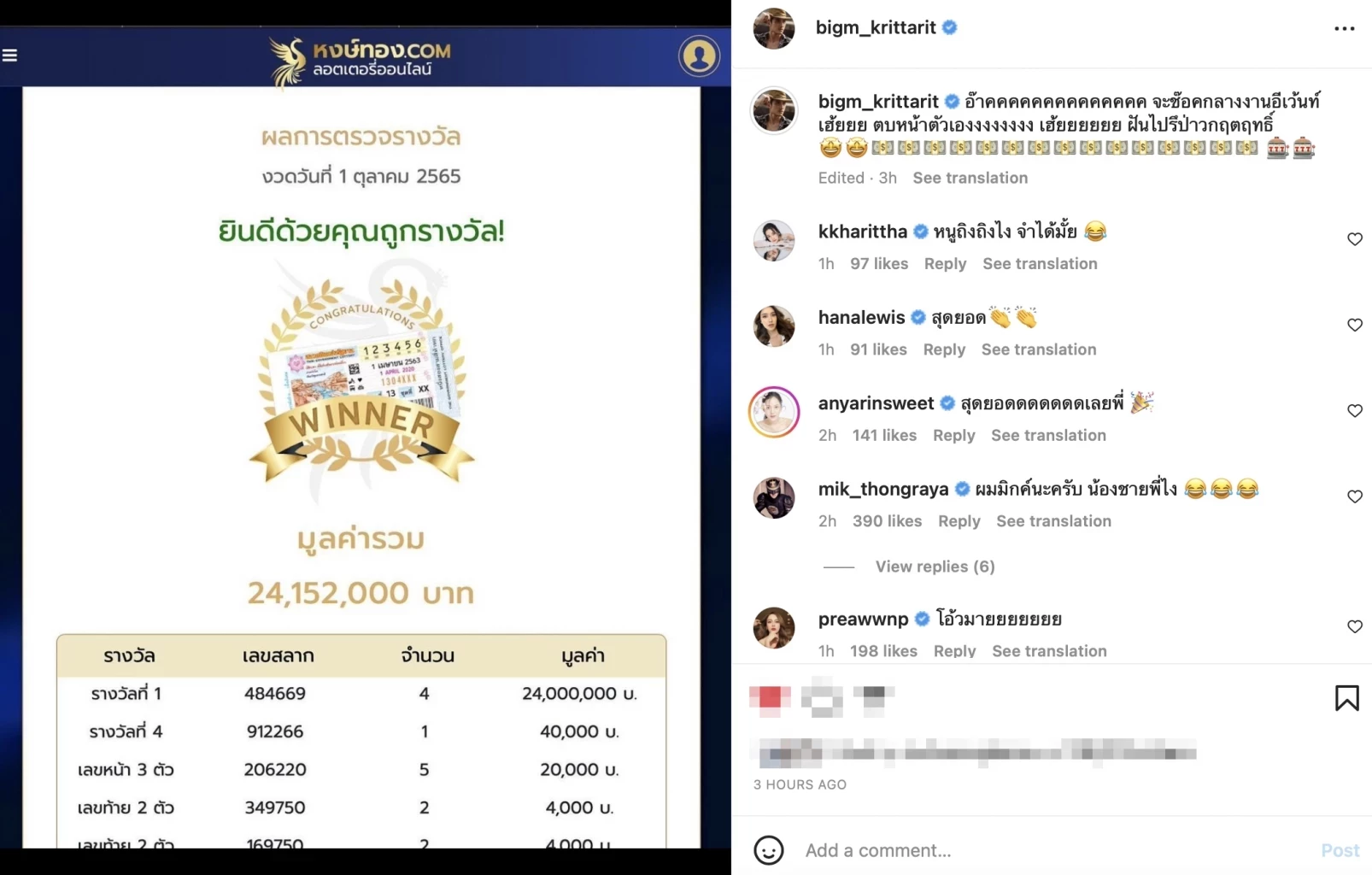ซึ่งล่าสุดทางด้าน บิ๊กเอ็ม กฤตฤทธิ์ ก็ได้เผยทาง TikTok @ch7hdofficial ถึงเรื่องที่ตนเองนั้นถูกรางวัลที่ 1 กล่าวว่า ตนเองได้ทำสบู่ขาย และมีรุ่นพี่ที่สนิทมาสั่งและตนได้ไปส่งที่โรงงาน ซึ่งรุ่นพี่คนดังกล่าวได้ทำโรงงานเพชร ตนเลยได้ไปเลือกซื้อแหวนเพชรมา 1 วง