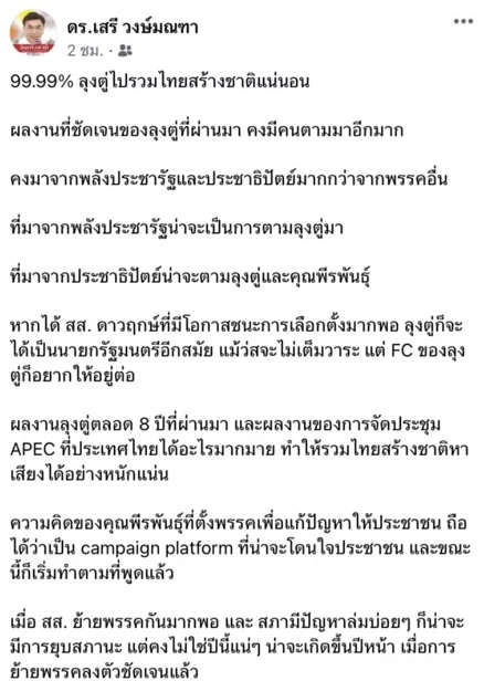 จากกรณีที่ วันที่ 24 พ.ย. 2565 ดร.เสรี วงษ์มณฑา นักวิชาการด้านการตลาดและการสื่อสาร ได้ออกมาเคลื่อนผ่านเฟสบุ๊กระบุว่า "99.99% ลุงตู่ไปรวมไทยสร้างชาติแน่นอนผลงานที่ชัดเจนของลุงตู่ที่ผ่านมา คงมีคนตามมาอีกมาก คงมาจากพลังประชารัฐและประชาธิปัตย์มากกว่าจากพรรคอื่น ที่มาจากพลังประชารัฐน่าจะเป็นการตามลุงตู่มาที่มาจากประชาธิปัตย์น่าจะตามลุงตู่และคุณพีระพันธุ์